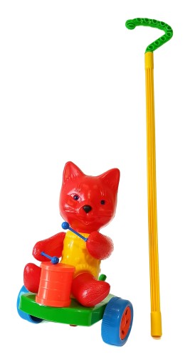 це іграшка-штовхач, виготовлена з сертифікованого та безпечного для дітей матеріалу в цікавих та привабливих кольорах. Дитина веде іграшку перед собою за допомогою прикріпленої палички. Кошеня в русі весело рухає головою і б’є паличками по барабану.
