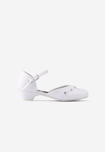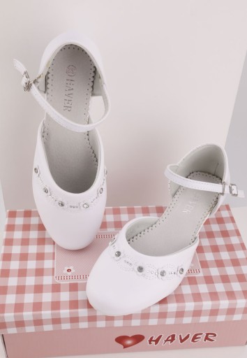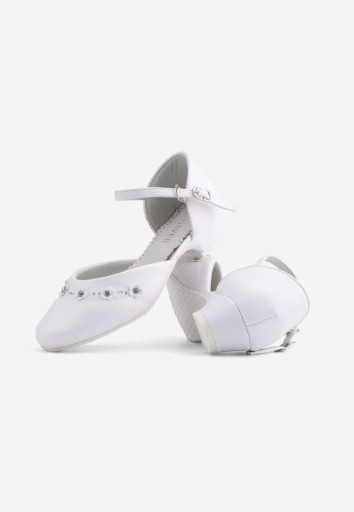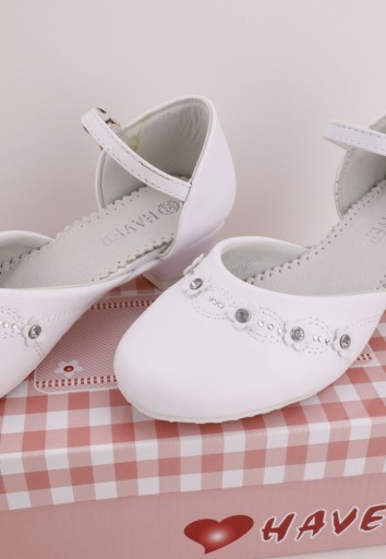 Балетки для дівчинки на низькому каблуці. Виготовлений з екологічної шкіри найвищої якості. Спереду красива прикраса у вигляді квітів. Застібається на регульований ремінець, який утримує взуття на нозі.Ідеально підходить як взуття для причастя, так і для інших важливих заходів.