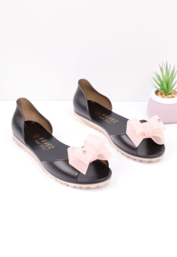 Дитячі балетки типу меліски на підошві в смужку. Верх вирізаний з боків, з відкритим носком. Прикрашена бантом спереду. Виготовлений повністю з гумового матеріалу. Ця модель ідеально впишеться в літні образи.