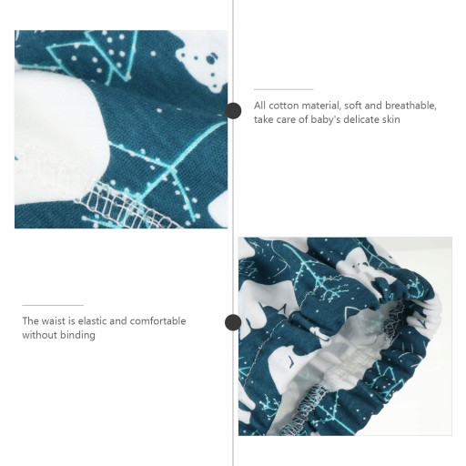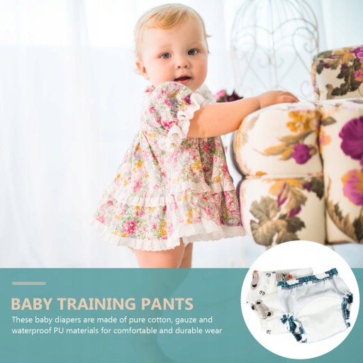 Ці дитячі підгузки виготовлені з чистої бавовни, марлі та водонепроникних ПУ матеріалів для комфорту та довговічності. Знімна конструкція шортів на шнурках дозволяє вашій дитині легко одягати та знімати підгузки. Ці тренувальні штани незамінні в повсякденному житті дітей.
