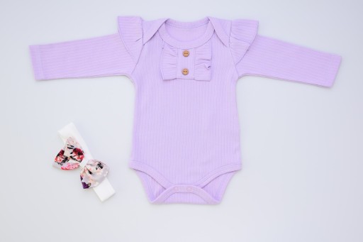 - Â â Фіолетовий тедді з довгим рукавом. Спереду два декоративних гудзики і оборки.