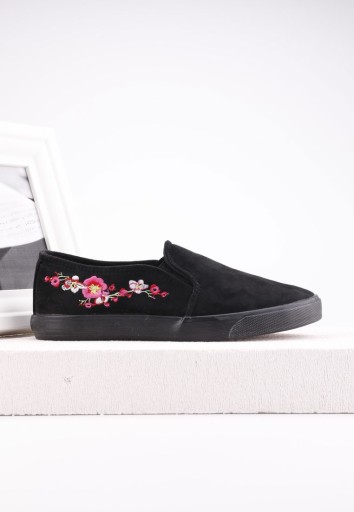 Кросівки жіночі, на плоскій підошві чорного кольору. Низький верх, виготовлений з еко-замші, прикрашений вишивкою у вигляді квітів. Сліпони з вшитими гумками з боків. Ідеально підходить для роботи