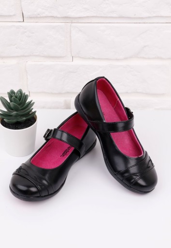 Балетки для дівчинки на плоскій підошві. Застібається на тонкий ремінець, що закінчується пряжкою. Виготовлені з екологічної шкіри, шкіряна вставка. Декоративна вишивка на носку взуття. Добре підійде під час сімейних свят.
