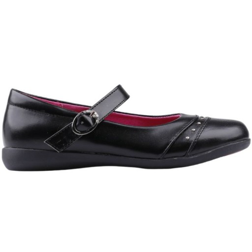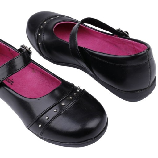 Балетки для дівчинки на плоскій підошві. Застібається на тонкий ремінець, що закінчується пряжкою. Виготовлені з екологічної шкіри, шкіряна вставка. Декоративна вишивка на носку взуття. Добре підійде під час сімейних свят.