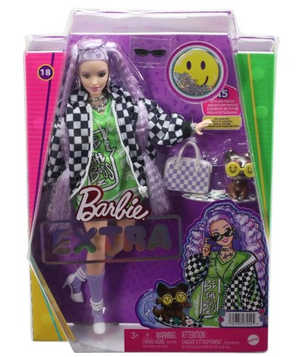Ляльки Barbie Extra демонструють унікальний і сміливий стиль EXTRA в модних нарядах яскравих кольорів. Кожна лялька Барбі має свій унікальний стиль. Кожен набір також включає різні фігурки тварин, усі вони виглядають дуже мило та модно! Лінійка Barbie Extra дозволяє дітям виражати себе, експериментуючи зі стилем і маючи захоплюючих веселих ляльок, які можна розміщувати в різних позах. Ці ляльки готові до модної пригоди з блиском, цукерками, емоціями та дивовижними зачісками, щоб справити велике враження, куди б вони не пішли. Продається окремо, за наявності. Ляльки не стоять окремо. Кольори та елементи декору можуть бути різними. Ляльки Barbie Extra люблять грати з модою, тому вони мають 15 аксесуарів, включаючи одяг, аксесуари, домашню тварину та аксесуари для домашньої тварини. Ця лялька має пишні вигини, ніж стандартна фігура Барбі, і оригінальну зачіску з дуже довгим пастельно-фіолетовим волоссям, зібраним у хвостики. Лялька виражає свій сміливий стиль завдяки унікальному вбранню, яке складається з неоново-зеленої сукні, великого чорно-білого піджака в клітку, лавандових шкарпеток і білих босоніжок з ремінцем. Картата сумочка, чорні міні-сонцезахисні окуляри та багато прикрас заохочують до виразності стилю та творчої гри. Її собака також дуже модна з великими сонцезахисними окулярами та картатою дошкою для серфінгу. Ляльки Barbie Extra стануть чудовим подарунком для дітей від 3 до 10 років, особливо для тих, хто любить одягатися.