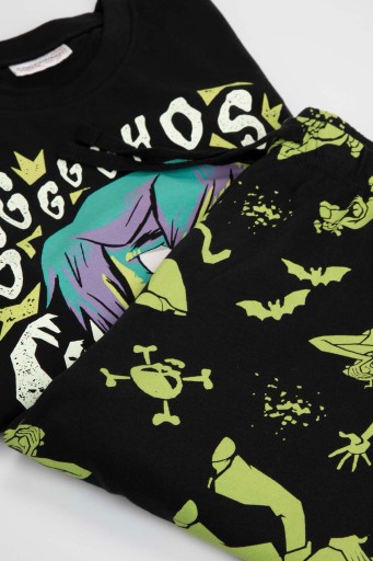 Піжама-двійка для хлопчика з комфортної бавовни. У комплект входить футболка з довгим рукавом і зручні довгі штани. Футболка має принт спереду. Штани зі шнурком на штанині, шнурком на талії та суцільним принтом. До 98 розміру застібки на горловині.