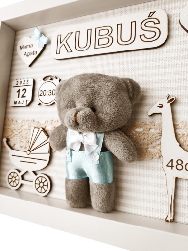 Всередині плюшевий ведмедик, одягнений у комбінезони, а на його шиї красивий метелик, присвячений хлопчику. Дівчині приємно одягнути плаття з квіткою на голову. Фон рамки в бежеві смужки. Білі плити HDF мають гравіювання: