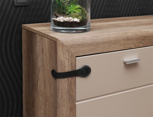 Замок для ящиків був розроблений, щоб гарантувати дорослій людині легкий доступ до вмісту меблів без необхідності знімати захист. Просто натисніть на захист у потрібному місці, і кліпса відкриється. Витягнувши необхідні аксесуари з шафи / ящика, просто закрийте замок для ящиків, і він знову виконує свою функцію. Огородження для шаф дуже естетично - встановлене на світлі меблі не привертає уваги.