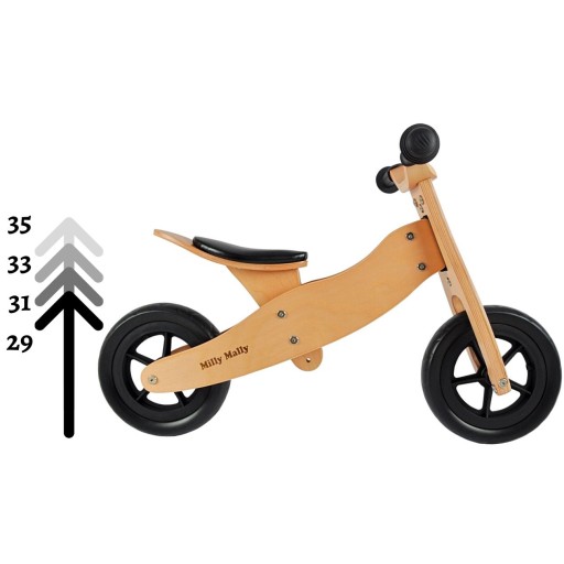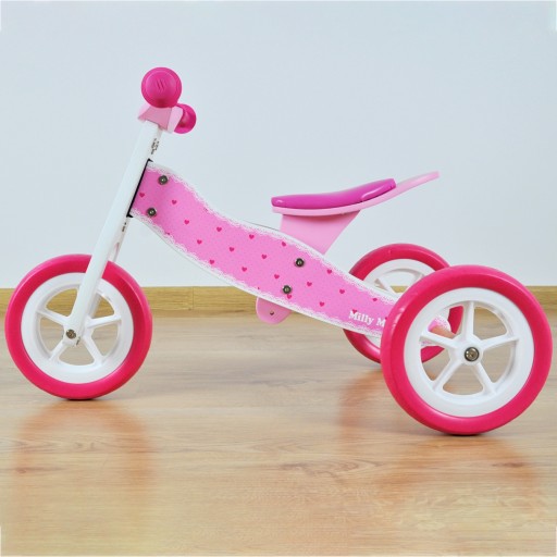 Велика перевага триколісного велосипедаМіллі Маллі Подивітьсяполягає в його універсальності. Вона проявляється як функціяскладання заднього моста- що дозволяє за кілька секунд перетворити триколісний велосипед на двоколісний бігунок.