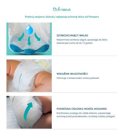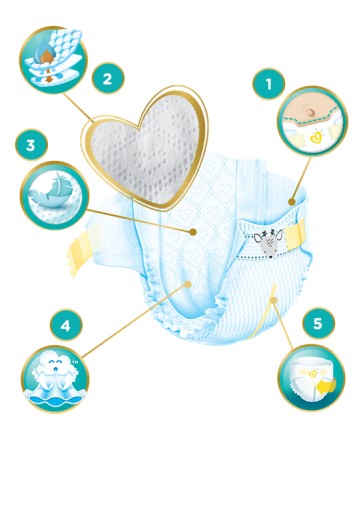 Підгузки Premium Care відрізняються розкішною шовковистою м'якістю, а завдяки абсорбуючим каналам вони вбирають воду і залишають шкіру дитини повністю сухою. Вбираюча система підгузків Premium Care забезпечує до 12 годин сухості.