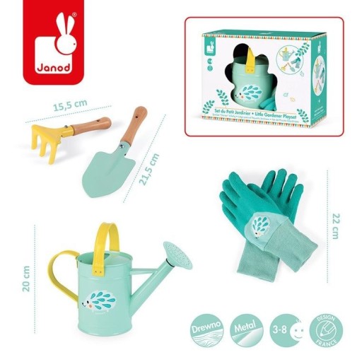 Набір садових інструментів з лійкою May Gardener від французького бренду JANOD - ідеальна іграшка для дитини, яка любить активно працювати в саду та наслідувати дорослих.У набір входять інструменти, зроблені з особливою ретельністю, упаковані в акуратну упаковку. картонна коробка. Ідеальний як подарунок.