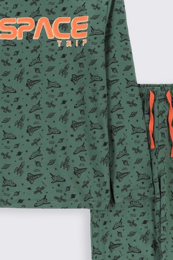 Піжама-двійка для хлопчика з комфортної бавовни. У комплект входить футболка з довгим рукавом і зручні довгі штани. На футболці та штанях принт космічного корабля. Штани зі шнурком на штанині та шнурком для регулювання на талії. До 98 розміру застібки на горловині.