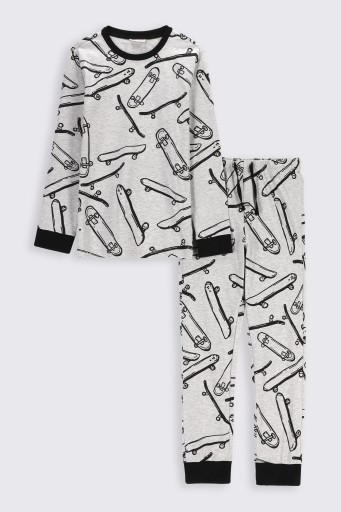 Піжама-двійка для хлопчика з комфортної бавовни. У комплект входить футболка з довгим рукавом і зручні довгі штани. На футболці та штанях принт зі скейтбордом. Штани зі шнурком на штанині та шнурком для регулювання на талії. До 98 розміру застібки на горловині.