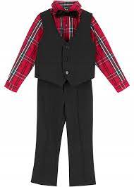 - Офіційний костюм із 4 предметів: червона сорочка в клітку, чорний жилет на ґудзиках, краватка-метелик і штани з воланами