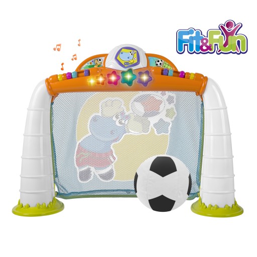 Розвиває точність і координацію у дитини. Табло, що світиться, показує набрані очки, а коли дитина потрапляє у ворота, воно винагороджує його світлом, співом стадіону та звуками підбадьорення!