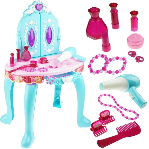 Великий туалетний столик з дзеркалом і підсвічуванням заохотить багатьох маленьких принцес пограти в перукаря. Казковий туалетний столик має всі необхідні аксесуари, щоб «зробити себе схожим на бога». Щоб маленька принцеса могла наслідувати маму чи сестричку та навчитися робити гарну зачіску.