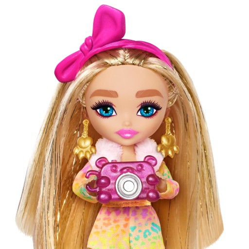 Ця лялька Barbie® Extra Minis™ вирушає в пригодницьке сафарі. Вона готова вирушити в подорож зі своїм довгим волоссям, зібраним у хвостики, і в комбінезоні з тваринним принтом із хутряним коміром.