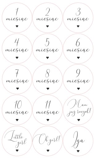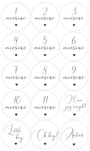 Діаметр дисків 9,5 см. У наборі 15 дисків:місяців від 1 до 11, Мені рік, Дівчинка або Маленький хлопчик, Ми чекаємо на Вас, Ім'я дитини.