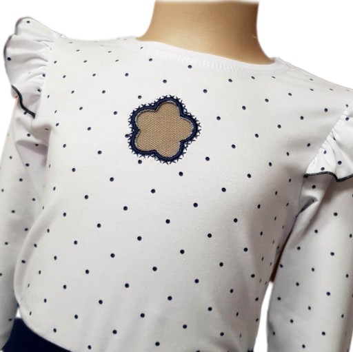 Модна біла бавовняна блуза для дівчинки в темно-синю крапочку.