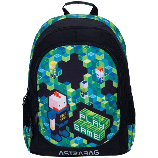Трьохкамерний рюкзак Astrabag із серії Play Game створений з урахуванням маленьких шанувальників комп'ютерних ігор. Піксельний і геометричний графічний мотив, що відсилає до найпопулярніших сучасних ігор, захопить серце кожного школяра. Рюкзак оснащений трьома місткими камерами, наповненими практичними відділеннями. У ньому використовується унікальна технологія Ergo Back, яка мінімізує тиск на плечі та хребет і забезпечує дитині відчуття комфорту.