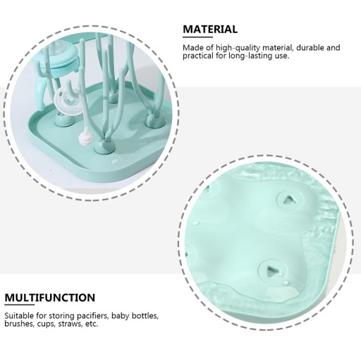 Сушарка для дитячих пляшечок виготовлена з поліпропіленового матеріалу, безпечна та здорова у використанні. Сушарка для пляшечок зберігає дитячі пляшечки без води, а вашу стільницю чистою. чудово виглядає на кухні або в туалеті. Ця підставка для сушіння дитячих пляшечок може вмістити більшість дитячих пляшечок і аксесуарів для годування. Щітка для чищення може допомогти вам очистити дитячі пляшечки.