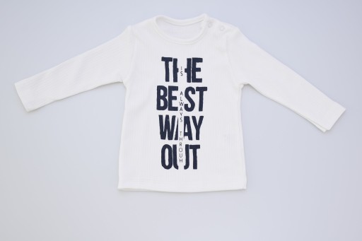 - Біла футболка з довгим рукавом, застібається на 2 кнопки на плечі. Спереду декоративний напис темно-синього кольору.