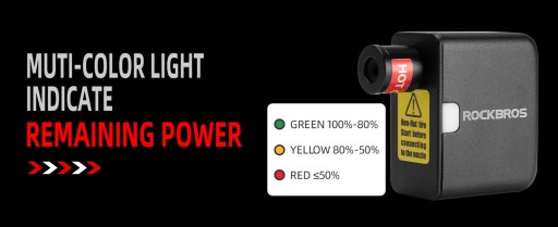 ШВИДКЕ ЗАРЯДЖАННЯ: міні-електричний компресор шин ROCKBROS займає лише 25 хвилин, щоб повністю зарядитися через зарядний кабель USB Type-C. Крім того, він має багатоколірний індикатор, який показує залишок заряду акумулятора: зелене світло вказує на 80-100% заряду; ці світильники 50-80% електроенергії; Червоне світло заряджено менше ніж на 50%.