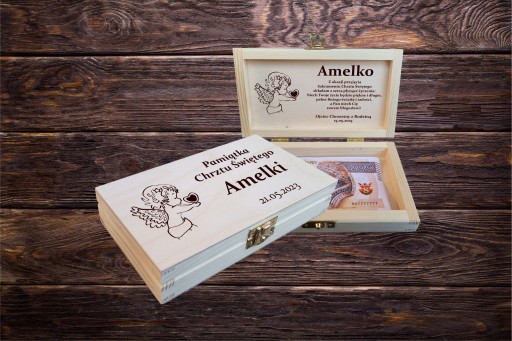 Бажаєте вишукано зробити подарунок у вигляді готівки? У нас є для вас рішення - скарбничка на хрещення, сувенір на хрещення. Коробка з гравіюванням - ідеальний подарунок. Подарунок 3 в 1: футляр для банкнот, побажань замість картки та коробка, яка буде сувеніром, яку можна використовувати як коробку для дрібничок.
