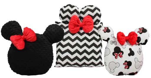 У набір входять 3 подушки у формі Міккі Мауса з милими бантиками. М'які подушки виготовлені з бавовняної тканини в поєднанні з норкою. Наповнювач - м'який антиалергічний силіконовий м'яч. Кольори відповідають всьому комплекту.
