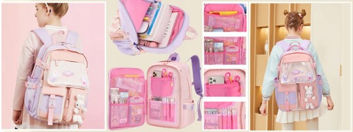 Цей милий рюкзак для дівчаток має 3 передні кишені та 2 основні кишені на блискавці. і задня протиугінна кишеня. 2 бічні кишені для парасольки та пляшки з водою. Перша головна кишеня на блискавці відкривається на 180° для зручного зберігання щоденних шкільних речей. Друга основна кишеня на блискавці вміщує книги та одяг, сумку для комп'ютера.