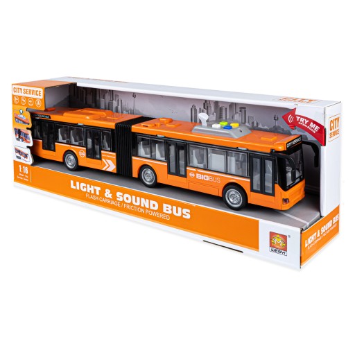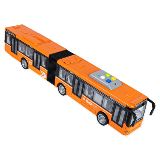 Наш зчленований автобус є мініатюрною версією справжнього міського автобуса. Він був розроблений з увагою до кожної деталі - його помаранчевий і чорний кольори відображають справжні міські автобуси, а відкриваються двері, реалістичний звук і гумові шини роблять розвагу максимально автентичним.