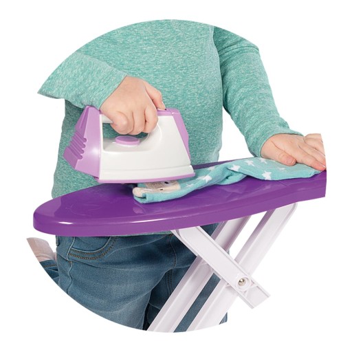 Іграшкова праска біло-рожевого кольору і оснащена імітацією парової кнопки. Праска не має гострих країв, що робить її абсолютно безпечною для дітей.