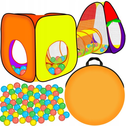 Набір 3 в 1 складається з двох наметів і з'єднувального тунелю. Елементи дитячого намету з кульками можна використовувати окремо або разом. Тунель можна з'єднати з декількома різними входами в наметі, завдяки чому ми можемо вільно конфігурувати ціле. Каркас наметів виготовлений із безпечного та міцного скловолокна, а барвистий матеріал, з якого виготовлені стіни, стійкий до розривів. Намет-іглу з тунелем доповнений 200 різнокольоровими кульками, які гарантують найкраще задоволення незалежно від віку. Вони виготовлені з м'якого та гнучкого матеріалу, який не деформується та швидко повертається до початкової форми - навіть після більш сильного тиску.