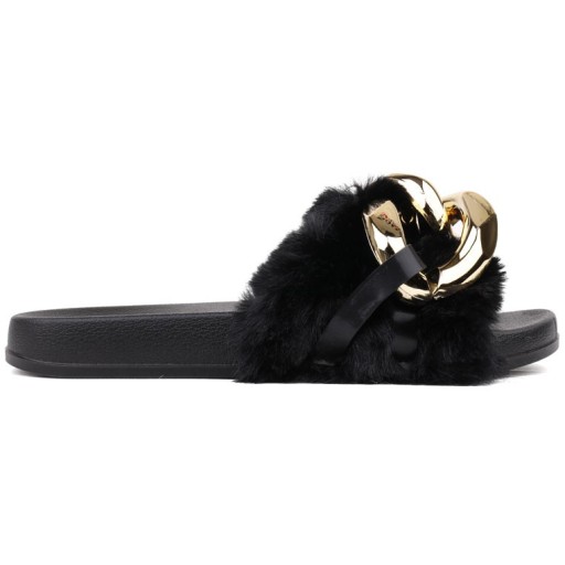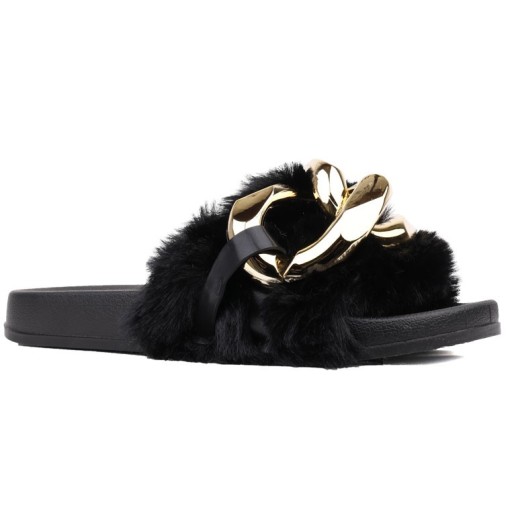 Шльопанці для дівчинки на плоскій гумовій підошві. Модель сліпони з відкритим носком і закругленим краєм. Стоп підтримує широкий хутряний пояс, прикрашений золотим ланцюжком. Це оригінальні шльопанці, з якими можна створити безліч модних стилів.