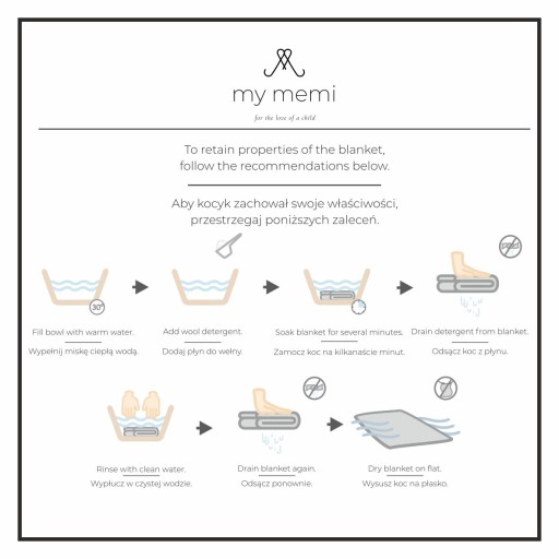 Крім того, прати ковдру з мериносової вовни можна дуже рідко, машинне прання на програмі, призначеній для прання вовни. Для прання використовуйте засоби, призначені для прання вовни. Висихає до смуг. Не сушіть на джерелі тепла, наприклад, на радіаторі.