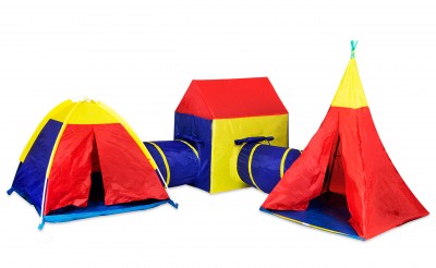 Комплект намету виготовлений з міцного матеріалу, що дозволяє використовувати дитячий майданчик в саду і вдома. У набір входить будиночок, тіпі, намет і 2 тунелі. Кожен елемент можна використовувати окремо та вільно конфігурувати. Намет, будиночок і тіпі мають пластикову раму з з’єднувачами, а тунелі мають систему самоскладання.