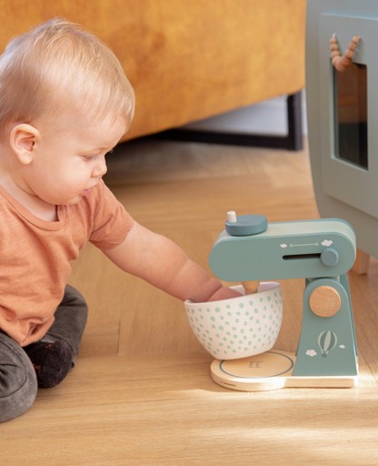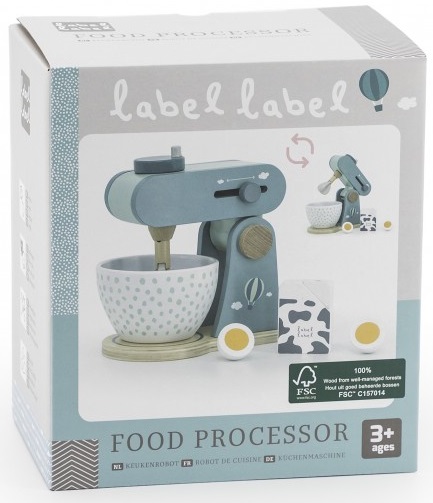 Ваш малюк може самостійно приготувати печиво або тістечка за допомогою цього милого кухонного комбайна Label. Кухонний комбайн і аксесуари, виготовлені з високоякісної деревини, сертифікованої FSC, прикрашені кольорами етикетки та символами за допомогою зручної для дітей фарби на водній основі.