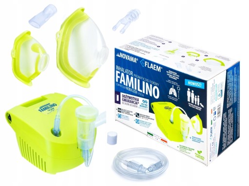 Підходить для будь-якого віку, включаючи дітей. Застосування: бронхіт, ларингіт, пневмонія, застуда, кашель, нежить, астма, синусит. Novama Familino - це повний аерозольний терапевтичний набір, ідеальний для домашнього використання, який включає в себе тихий компресор з можливістю безперебійної, безвідмовної роботи (безперервної роботи), приємний для вуха звук і повний набір аксесуарів разом з інноваційними Небулайзер RF8 Evo з системою економії ліків і 2 режимами розпилення.