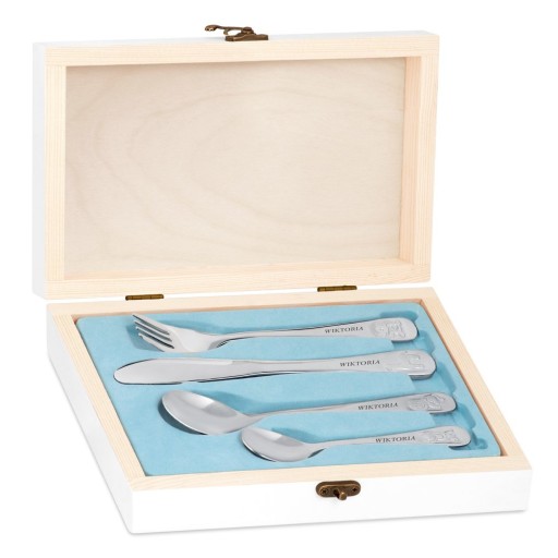 Вам цікаво, який подарунок буде доречним на хрещення чи день народження дитини, для цього чудово підійде набір столових приборів з гравіюванням. У набір входить якісна виделка, ложка, ложка і ложка. На кожному зі столових приладів ми зустрінемо веселу тваринку, яка неодмінно зробить їжу приємнішою для маленького споживача. Крім того, ми можемо вигравірувати всі елементи гравіюванням на ваш вибір - наприклад, ім'я вашої дитини. Набір упакований в ретельно виготовлений дерев'яний футляр з оксамитовим наповненням. На коробці є барвистий принт, який ви можете персоналізувати за власним бажанням. Цей набір стане чудовим подарунком для будь-якої дитини.