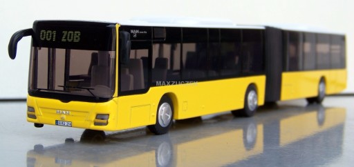 Зчленований автобус MAN Lions City, виготовлений із металевих і пластикових деталей у масштабі 1:50, відображає зовнішній вигляд справжнього автомобіля. Ідеальна іграшка для маленьких водіїв і приваблива колекційна модель.