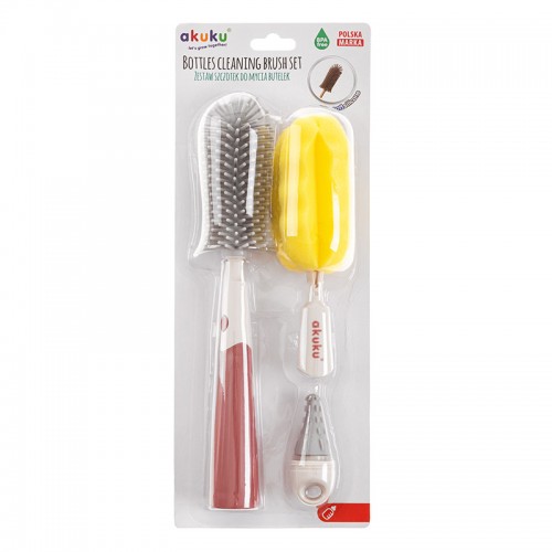 Набір оснащений двома змінними наконечниками для миття пляшок, що складаються з щітки з м'якою силіконовою щетиною, яка забезпечує миття пляшок і пляшок без подряпин, і змінного наконечника з губкою, яка має профіль для ще більшого очищення пляшки. ретельно. Правильно профільований наконечник дістає до важкодоступних місць, а зручна рукоятка проти ковзання забезпечує надійний хват. У комплект також входить силіконова насадка для чищення пустушок. Щітка має отвір для висихання перед наступним використанням. Виготовлений з міцних і безпечних матеріалів, які не містять Бісфенол А (% BPA).