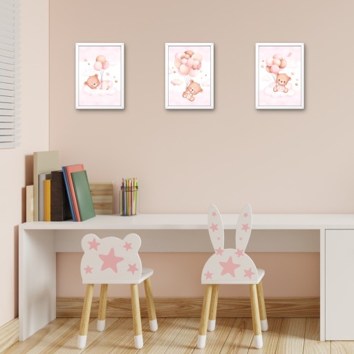 - Пастельні відтінки рожевого і милі плюшеві ведмедики з повітряними кульками ідеально підійдуть до будь-якого інтер'єру дитячої кімнати, додавши витонченості, ніжності та шарму.