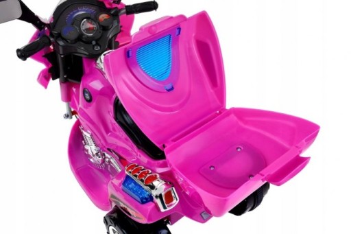Інші елементи, які є великими перевагами конструкції моделі HC8051 - це прозорий обтічник, бічні дзеркала та світлодіодне освітлення, що покращує видимість дитини на дорозі.Ззаду рожевого мотоцикла є багажник, що відкривається, у якому маленький водій може зберігати його скарби. Він також підтримує дитину, не даючи їй рухатися занадто далеко назад. Елемент, який не можна ігнорувати, це кнопки звукового сигналу та музики, розташовані біля керма. Тепер кожна дитина зможе відчути себе в ролі справжнього водія, сигналячи друзям, що проїжджають повз.