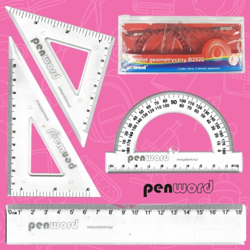 У набір входить: лінійка 18 см, косинець 60 градусів, косинець 45 градусів і лінійка 180 градусів.