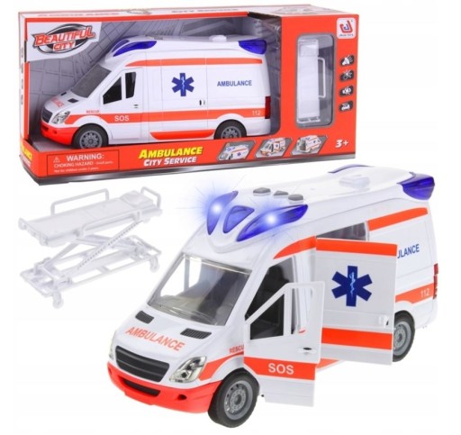 Автомобіль швидкої медичної допомоги з фрикційним приводом призначений для проведення рятувальних робіт. Машина швидкої допомоги має двері в салон, що відкриваються, бокові двері, що відкриваються, багажник відкривається. Всередині багажника є місце для носилок, що входять в комплект. Ноші полегшать транспортування пораненого до лікарні. На даху є звуковий і світловий модуль, який забезпечить багато годин радісного задоволення. Просто ввімкніть сирену і вперед.