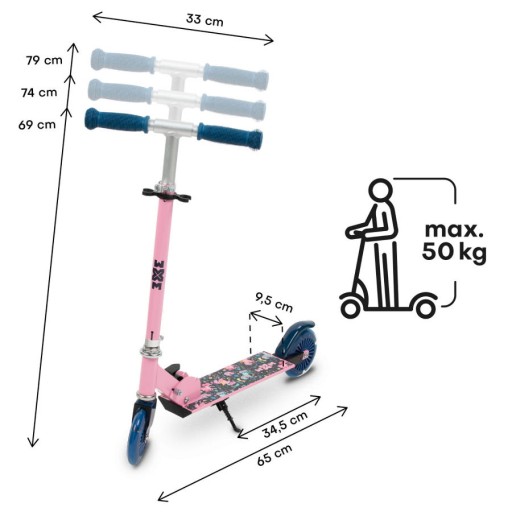 - Матеріали: Платформа, кермо: алюміній; Колеса: PU