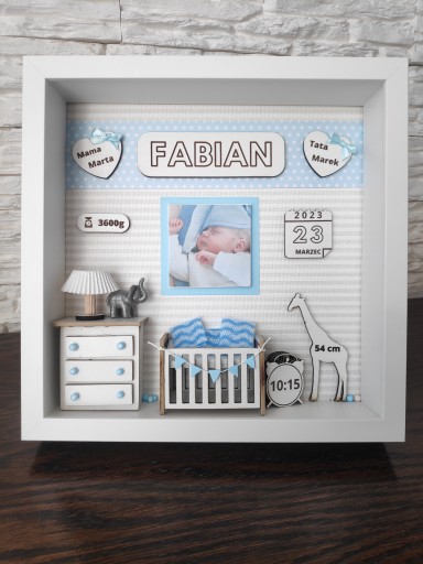 Свідоцтво про народження ручної роботи у вигляді 3D рамки для хлопчика з його фото, розміром 2727 см, з оргсклом.