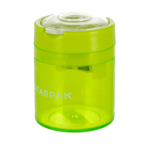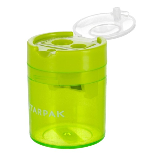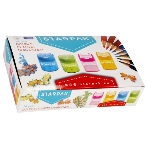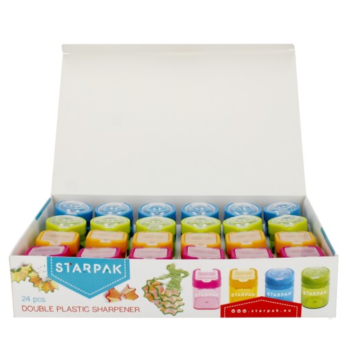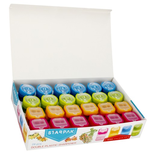 Переваги продукту: Подвійна точилка з колекції STARPAK, призначена для офісу та школи. Точилка з легкого пластику двох різних форм і чотирьох кольорів: синій, зелений, цей і рожевий. Точилка з контейнером для ниток, призначена для заточування крейди та олівців. Дивіться також інші продукти Starpak із серії, призначені для шкіл та офісів Точилка упакована в вітрину по 24 шт. Продукт призначений для дітей віком: 3 роки. х г. см: 6x28x19, вага упаковки кг.0,57 кг. Розміри точила: висота х ширина х г. см - квадрат 5х4х4, круглий 5х4х4, вага виробу кг. 0,02 кг. Упаковано в коробку по 288 шт.