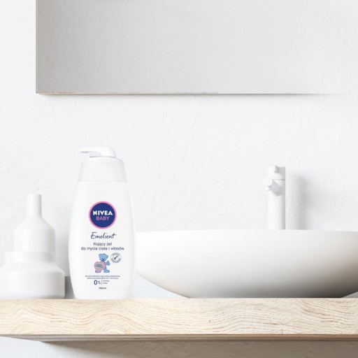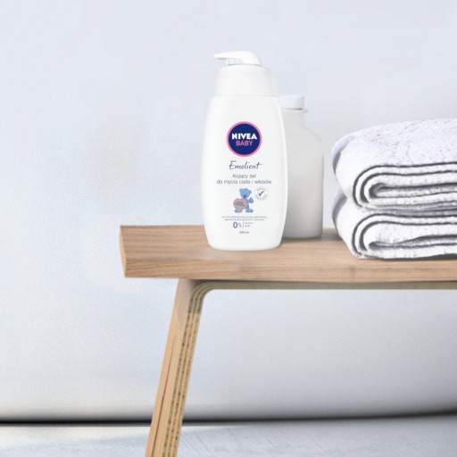 Знайомтеся з NIVEA BABY Emolient Заспокійливий гель для миття тіла та волосся для сухої, чутливої, подразненої та схильної до атопії шкіри. З першого дня життя.