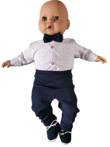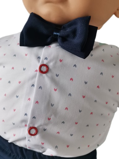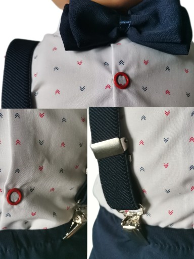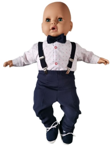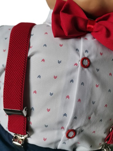 Сорочки з довгими рукавами з модним малюнком. Застібається на зручні кнопки. Краватка-метелик, зав'язаний стрічкою, додає шику та елегантності. Штани виготовлені з ніжного матеріалу, розрізані по краю, мають елегантний манжет внизу штанини. Еластичний пояс. Однак увагу привертає обробка комплекту - привабливі підтяжки різних кольорів на вибір